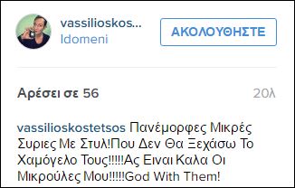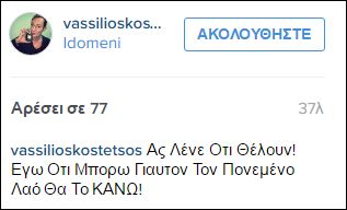 «Ας λένε ότι θέλουν. Εγώ ό,τι μπορώ γι’ αυτόν τον πονεμένο λαό θα το κάνω», έγραψε στη σελίδα του στο μέσο κοινωνικής δικτύωσης ο Βασίλειος Κωστέτσος.