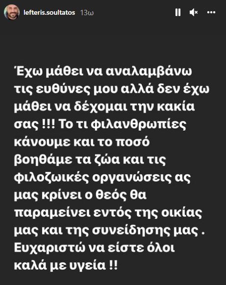 “Καλησπέρα σε όλους τους φιλόζωους. Αν και δεν συνηθίζω να δίνω εξηγήσεις επειδή τα έχω καλά με τη συνείδησή μου, με λύπη μου είδα την επίθεση που έγινε στη γυναίκα μου σε μία φωτογραφία που ανέβασε τα κουτάβια μας. Αν θέλετε λοιπόν κάποιον να πυροβολήσετε φιλόζωοι, αλλά ορισμένοι μισητές των ανθρώπων, τότε ελάτε στο δικό μου προφίλ γιατί το σκυλί είναι δικό μου και έχω την πλήρη ευθύνη του. Άρα εμένα να βρίσετε, εμένα να απειλήσετε εμένα να καταγγείλετε”, έγραψε αρχικά ο Λευτέρης Σουλτάτος.