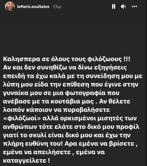 “Καλησπέρα σε όλους τους φιλόζωους. Αν και δεν συνηθίζω να δίνω εξηγήσεις επειδή τα έχω καλά με τη συνείδησή μου, με λύπη μου είδα την επίθεση που έγινε στη γυναίκα μου σε μία φωτογραφία που ανέβασε τα κουτάβια μας. Αν θέλετε λοιπόν κάποιον να πυροβολήσετε φιλόζωοι, αλλά ορισμένοι μισητές των ανθρώπων, τότε ελάτε στο δικό μου προφίλ γιατί το σκυλί είναι δικό μου και έχω την πλήρη ευθύνη του. Άρα εμένα να βρίσετε, εμένα να απειλήσετε εμένα να καταγγείλετε”, έγραψε αρχικά ο Λευτέρης Σουλτάτος.