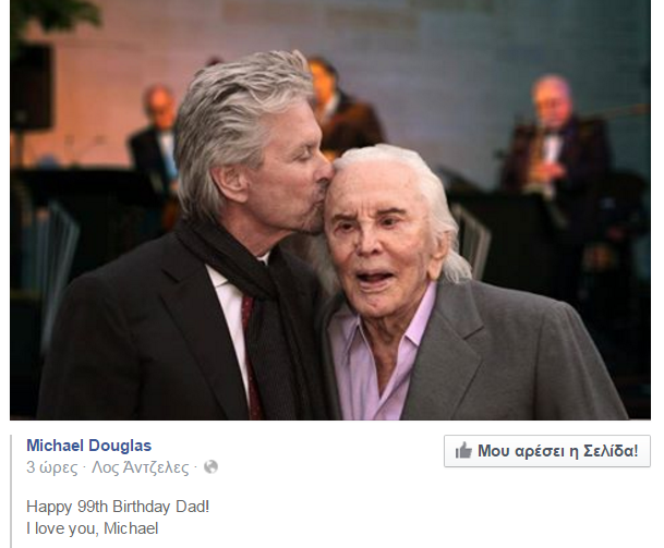 Ποστάροντας μία συγκινητική φωτογραφία στα social media ο Μάικλ Ντάγκλας ευχήθηκε «χρόνια πολλά» στον 99χρονο πατέρα του.