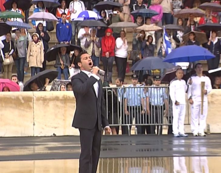 Ο γνωστός, παγκοσμίου φήμης ‘Ελληνας τενόρος – και με πολλές εμφανίσεις στα μεγαλύτερα θέατρα της Βρετανίας – τραγούδησε με πάθος και λυρισμό τον Εθνικό μας ‘Υμνο, κάτω από καταρρακτώδη βροχή…