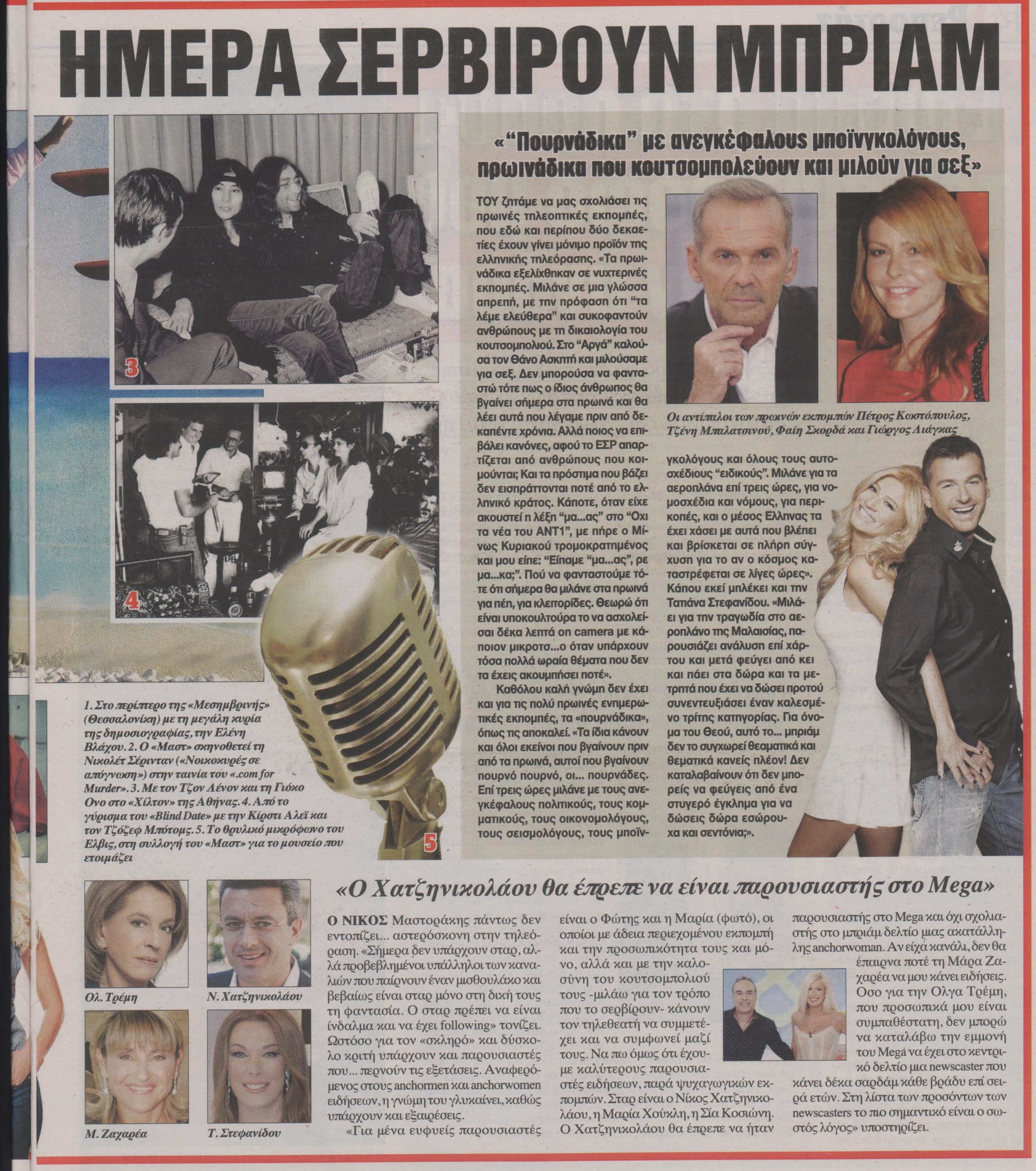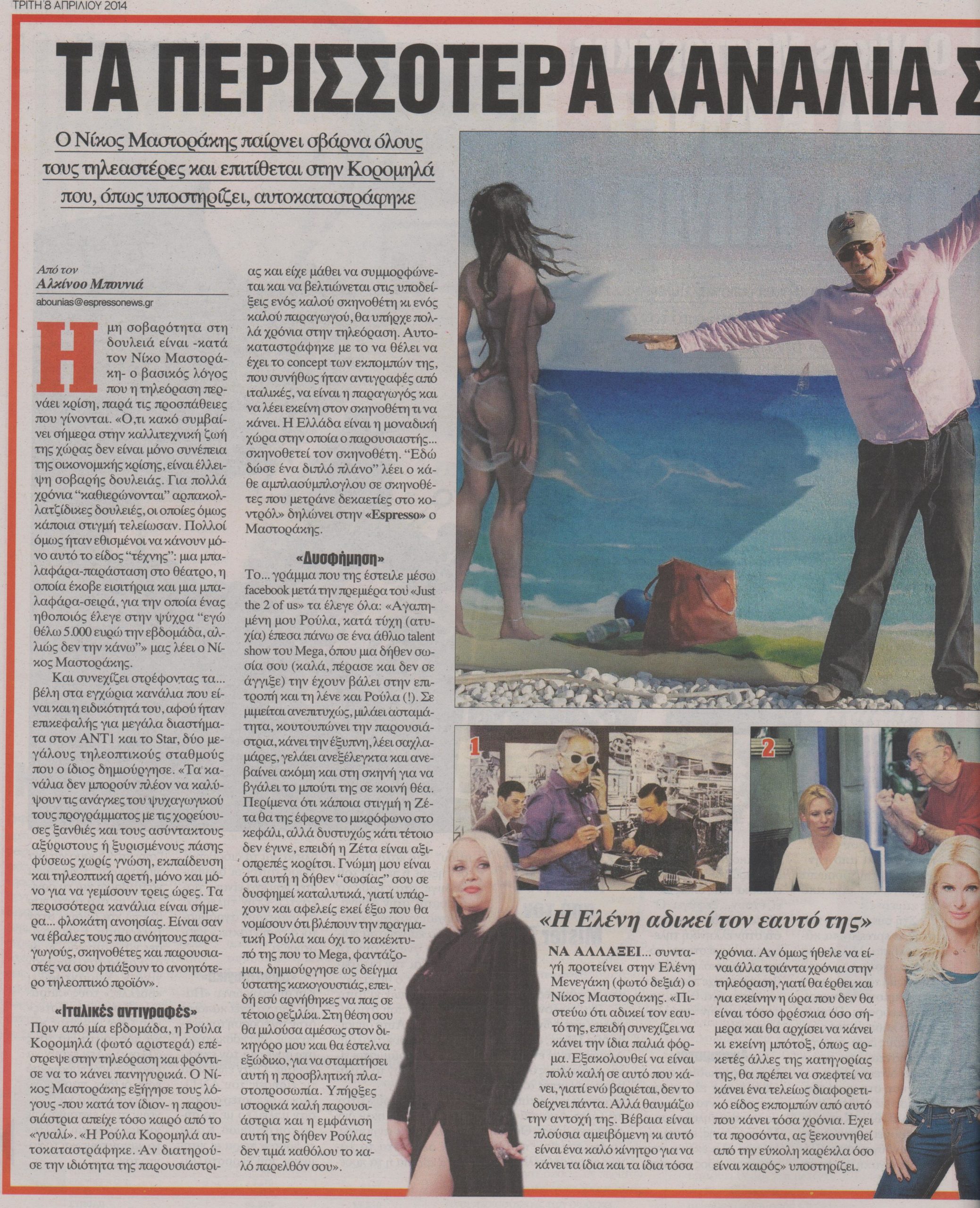 Και συνεχίζει, στρέφοντας τα…βέλη στα εγχώρια κανάλια που είναι και η ειδικότητά του, αφού ήταν επικεφαλής για μεγάλα διαστήματα στον ΑΝΤ1 και το Star, δύο μεγάλους τηλεοπτικούς σταθμούς που ο ίδιος δημιούργησε. «Τα κανάλια δεν μπορούν πλέον να καλύψουν τις ανάγκες του ψυχαγωγικού του προγράμματος με τις χορεύουσες ξανθιές και τους ασύντακτους αξύριστους ή ξυρισμένους πάσης φύσεως χωρίς γνώση, εκπαίδευση και τηλεοπτική αρετή, μόνο και μόνο, για να γεμίσουν τρεις ώρες. Τα περισσότερα κανάλια είναι σήμερα…φλοκάτη ανοησίας. Είναι σαν να έβαλες τους πιο ανόητους παραγωγούς, σκηνοθέτες και παρουσιαστές να σου φτιάξουν το ανοητότερο τηλεοπτικό προϊόν».