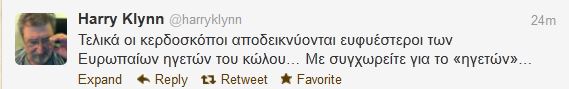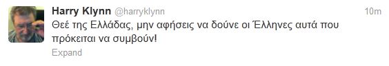 «Θεέ της Ελλάδας, μην αφήσεις να δούνε οι Έλληνες αυτά που πρόκειται να συμβούν!», ανέφερε σε σχόλιο μέσω του προσωπικού του λογαριασμού στο Twitter, για να προσθέσει αργότερα: «Τελικά οι κερδοσκόποι αποδεικνύονται ευφυέστεροι των Ευρωπαίων ηγετών του κ..υ. Με συγχωρείτε για το ‘ηγετών’».