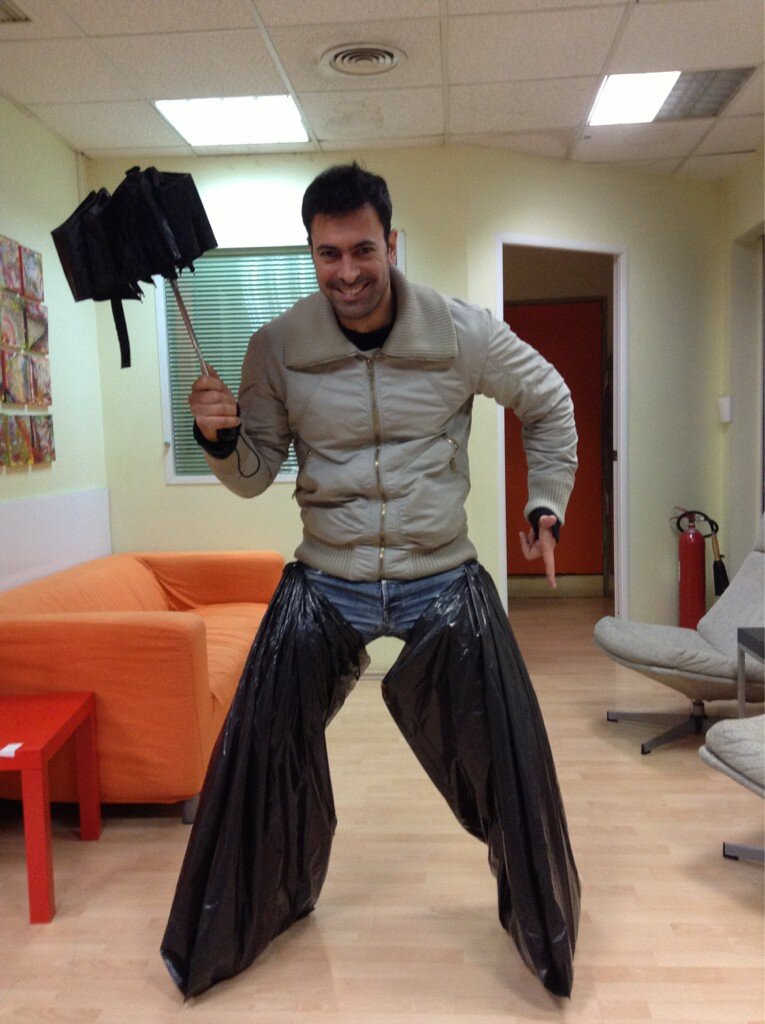 Ο ραδιοφωνικός παραγωγός φόρεσε δύο μαύρες σακούλες στα πόδια του και κρατώντας μία ομπρέλα θύμιζε τον…Λούκι Λουκ.