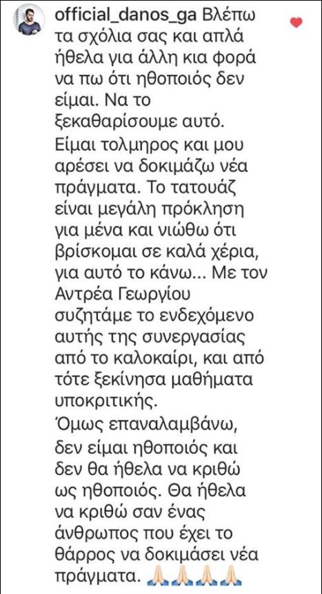 «Βλέπω τα σχόλιά σας και απλά ήθελα για άλλη μία φορά να πω ότι ηθοποιός δεν είμαι. Να το ξεκαθαρίσουμε αυτό. Είμαι τολμηρός και μου αρέσει να δοκιμάζω νέα πράγματα. Το τατουάζ είναι μεγάλη πρόκληση για μένα και νιώθω ότι βρίσκομαι σε καλά χέρια, για αυτό το κάνω… Με τον Ανδρέα Γεωργίου συζητάμε το ενδεχόμενο αυτής της συνεργασίας από το καλοκαίρι και από τότε ξεκίνησα μαθήματα υποκριτικής. Όμως επαναλαμβάνω, δεν είμαι ηθοποιός και δεν θα ήθελα να κριθώ ως ηθοποιός. Θα ήθελα να κριθώ σαν ένας άνθρωπος που έχει το θάρρος να δοκιμάσει νέα πράγματα», έγραψε ο Ντάνος και συγκέντρωσε πολλά like για την ψύχραιμη και νηφάλια τοποθέτησή του.