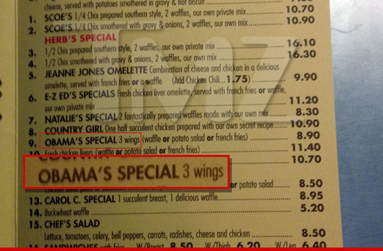 Ίσως σας φανεί λίγο περίεργο, αλλά είναι πραγματικότητα! Ο Barack Obama, ο 44ος Πρόεδρος των ΗΠΑ, έγινε…πιάτο σε μενού! Είναι η πρώτη φορά στην ιστορία της Αμερικής, που συμβαίνει κάτι τέτοιο!Ένα εστιατόριο, το Roscoe, για να τιμήσει τον Πρόεδρο, που είνα πελάτης του, αποφάσισε να μετονομάσει ένα από τα πιάτα του σε Obama’ s special menu. Ιδού το αποδεικτικό στοιχείο…