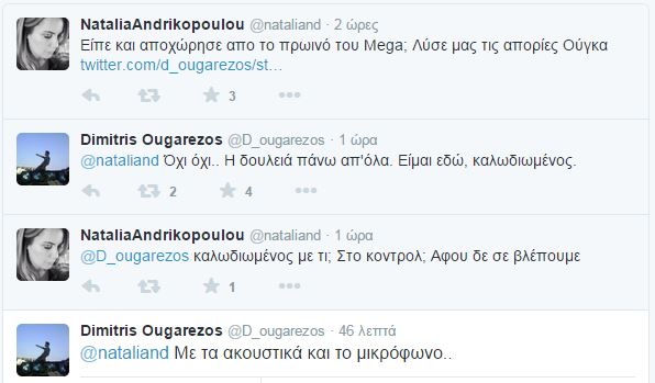Ενώ λοιπόν, δεν είδαμε τον Δημήτρη Ουγγαρέζο στην εκπομπή, εκείνος έγραψε στον προσωπικό του λογαριασμό στο twitter ως απάντηση σε follower του: «Η δουλειά είναι πάνω από όλα. Είμαι εδώ, καλωδιωμένος. Με τα ακουστικά και το μικρόφωνο».