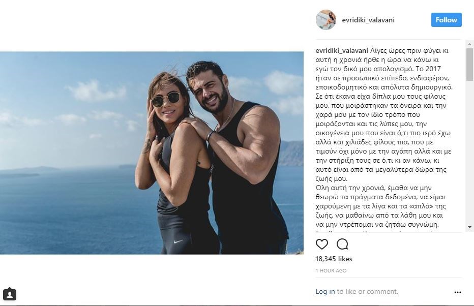 Τον δικό της απολογισμό για τη χρονιά που πέρασε, έκανε η Ευρυδίκη Βαλαβάνη και μέσα σε αυτόν περιλαμβάνεται και ο Κωνσταντίνος Βασάλος. Ο έρωτάς τους γεννήθηκε μέσα στο Survivor και εξελίχθηκε σε σχέση μετά το τέλος του παιχνιδιού.