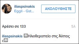 Τις χριστουγεννιάτικες διακοπές του απολαμβάνει στο Γκστάαντ της Ελβετίας ο Ηλίας Ψινάκης. Ο δήμαρχος Μαραθώνα ανέβασε μια φωτογραφία στον προσωπικό του λογαριασμό στο Instagram από τις ηλιόλουστες Άλπεις με το ακόλουθο σχόλιο: «Ηλιοθεραπεία στις Άλπεις».