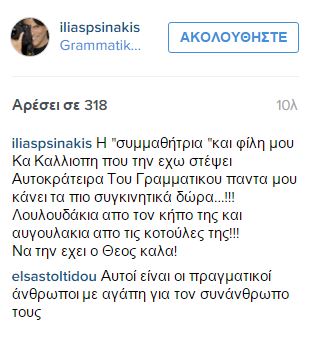 Ο Ψινάκης ανέβασε τη φωτογραφία γράφοντας χαρακτηριστικά:«Η “συμμαθήτρια “και φίλη μου κα Καλλιοπη που την εχω στέψει Αυτοκράτειρα Του Γραμματικου παντα μου κάνει τα πιο συγκινητικά δώρα…!!! Λουλουδάκια απο τον κήπο της και αυγουλακια απο τις κοτούλες της!!!Να την εχει ο Θεος καλα!».