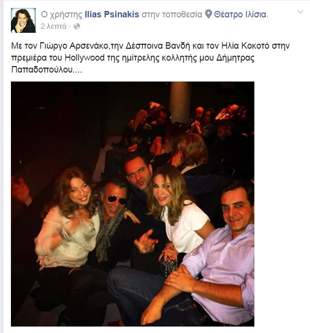 Ο Ψινάκης δημοσίευσε στο facebook μία φωτογραφία του από την πρεμιέρα της παράστασης, όπου μαζί του είναι η Δέσποινα Βανδή, ο Γιώργος Αρσενάκος και ο Ηλίας Κοκοτός.