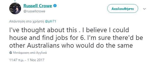 “Θεωρώ ότι μπορώ να φιλοξενήσω και να βρω δουλειά σε έξι (από αυτούς). Είμαι σίγουρος ότι θα υπάρχουν και άλλοι Αυστραλοί που θα έκαναν το ίδιο”, έγραψε.