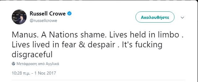 “Οι 600 αιτούντες άσυλο που έχουν οχυρωθεί μέσα σε ένα εγκαταλελειμμένο κέντρο κράτησης στην Παπούα Νέα Γουινέα χωρίς φαγητό ή τρεχούμενο νερό είναι η ‘ντροπή’ της Αυστραλίας”, δήλωσε σήμερα ο βραβευμένος με Όσκαρ ηθοποιός Ράσελ Κρόου, ο οποίος μάλιστα προσφέρθηκε να φιλοξενήσει έξι από αυτούς.