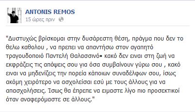 “Δυστυχώς βρίσκομαι στη δυσάρεστη θέση, πράγμα που δεν το θέλω καθόλου, να πρέπει να απαντήσω στον αγαπητό τραγουδοποιό Παντελή Θαλασσινό. Κακό δεν είναι στη ζωή να εκφράζεις τις απόψεις σου για όσα συμβαίνουν γύρω σου, κακό είναι να μηδενίζεις την πορεία κάποιων συναδέλφων σου, ίσως ακόμη χειρότερο να ασχολείσαι εσύ με τους άλλους για να απασχολήσεις. Ίσως θα έπρεπε να είμαστε λίγο πιο προσεκτικοί όταν αναφερόμαστε σε άλλους” σημείωσε ο τραγουδιστής μέσω facebook.