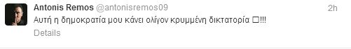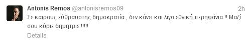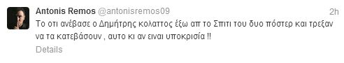 Ο Αντώνης Ρέμος σχολιάζει μέσω twitter τη σύλληψη του σκηνοθέτη Δημήτρη Κολλάτου χαρακτήριζοντάς την “υποκρισία”.