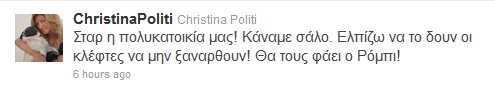Η Χριστίνα Πολίτη σοκαρίστηκε μετά από τη διάρρηξη που έγινε σε διαμέρισμα στην πολυκατοικία που μένει εκείνη αλλά και ο Ηλίας Ψινάκης, στον περιφερειακό Λυκαβηττού.”Τις προάλλες έβαλαν σκάλα και μπήκαν μέσα σε ένα σπίτι μέρα μεσημέρι. Πηδάνε στα μπαλκόνια χωρίς να λογαριάζουν κανέναν” είπε τρομαγμένη και συμπλήρωσε, “πρέπει να προσέχουμε που ανοίγουμε γιατί οι δράστες χρησιμοποιούν χίλια μέσα, λένε για παράδειγμα ότι είναι για έρανο”, είπε στην εκπομπή ”Made in Star”.Μετά από την εμφάνιση της στην εκπομπή ”Made in Star”, η γνωστή κοσμικογράφος με το χιούμορ που την διακρίνει έγραψε στο Twitter, ότι ελπίζει να μην ξανάρθουν οι κλέφτες και ότι αν το τολμήσουν θα τους φάει το σκυλάκι της. Παρακαλώ προσέξτε το μέγεθος του Ρόμπι!