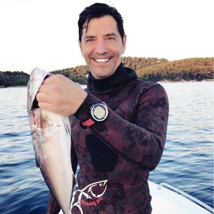 Φορώντας στολή κατάδυσης, ο Σάκης Ρουβάς χαμογελά στην κάμερα δείχνοντας το μεγάλο ψάρι που έπιασε.