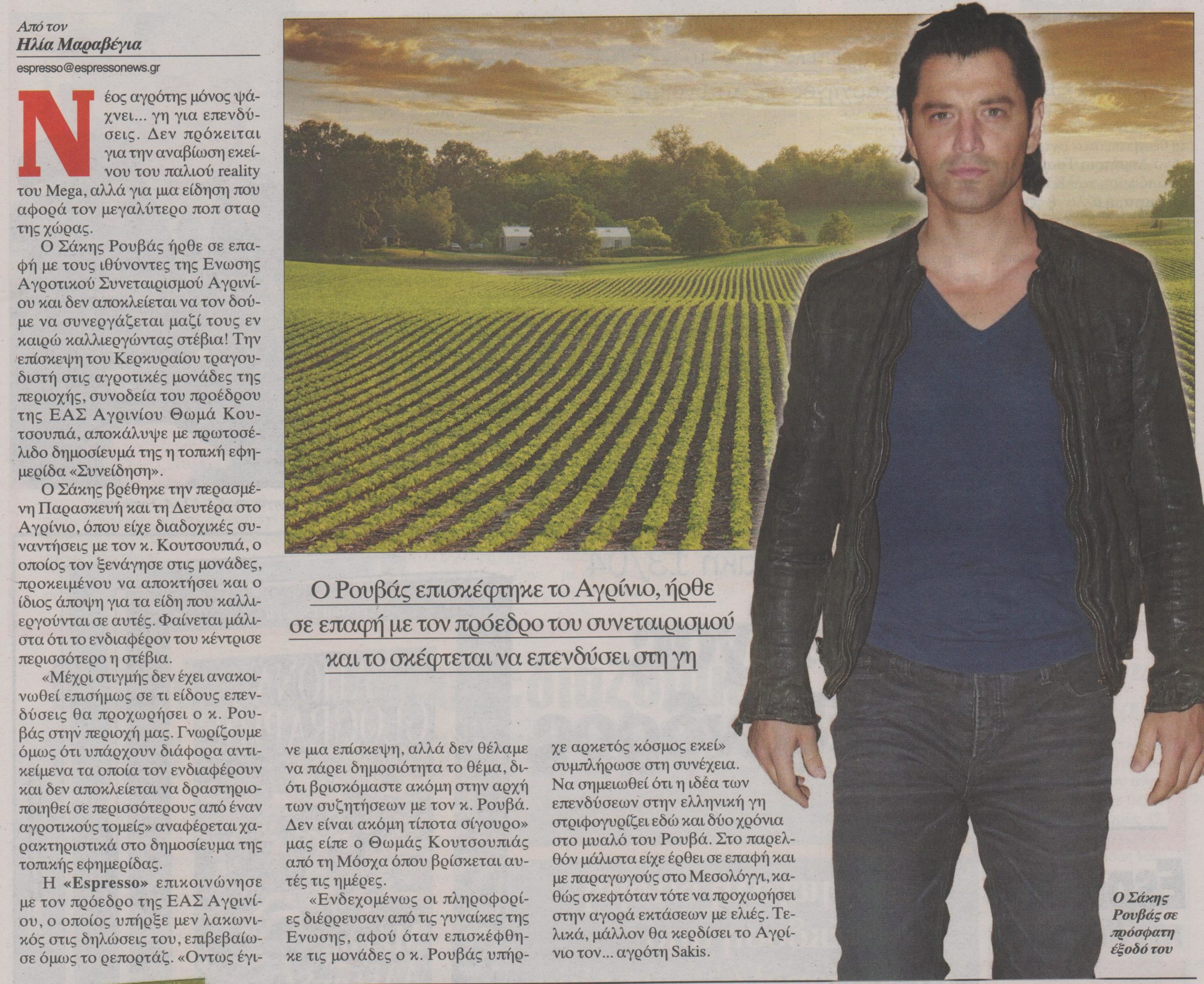 Ο Σάκης Ρουβάς ήρθε σε επαφή με τους ιθύνοντες της Ένωσης Αγροτικού Συνεταιρισμού Αγρινίου και δεν αποκλείεται να τον δούμε να συνεργάζεται μαζί με τους εν καιρώ καλλιεργώντας στέβια! Την επίσκεψη του Κερκυραίου τραγουδιστή στις αγροτικές μονάδες της περιοχής, συνοδεία του Προέδρου της ΕΑΣ Αγρινίου Θωμά Κουτσουπιά, αποκάλυψε με πρωτοσέλιδο δημοσίευμά της η τοπική εφημερίδα «Συνείδηση».