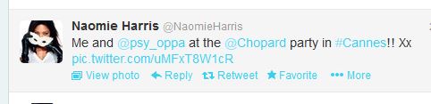 Η ηθοποιός Ναόμι Χάρις ανέβασε στον προσωπικό της λογαριασμό στο twitter μία φωτογραφία με τον σωσία του PSY σχολιάζοντας: “Εγώ και ο PSY σε πάρτι της Chopard στις Κάννες”