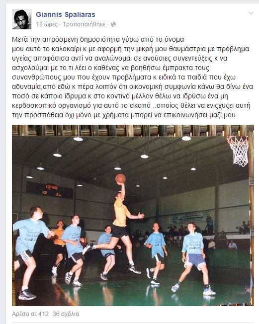 Ο Γιάννης Σπαλιάρας έγραψε στο προφίλ του στο facebook ότι αποφάσισε να σταματήσει να δίνει ανούσιες συνεντεύξεις και ότι θέλει να βοηθήσει έμπρακτα τους συνανθρώπους του και κυρίως τα παιδιά.