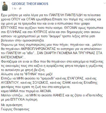 Μέσω της σελίδας του στο Facebook σχολίασε ο Γιώργος Θεοφάνους το τραγούδι του Παντελή Παντελίδη με την αναφορά στα Κατεχόμενα.