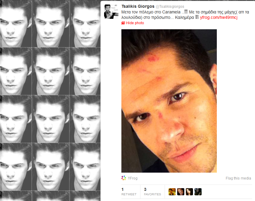 “Τραυματική” ήταν η βραδιά της Παρασκευής για το γνωστό τραγουδιστή Γιώργο Τσαλίκη, αφού του άφησε μερικά…σημάδια στο πρόσωπο. Μην πάει βέβαια ο νους σας στο κακό…Κατά τη διάρκεια της εμφάνισής του στο κέντρο “Caramela” κι ενώ το κέφι είχε ανάψει για τα καλά ο λουλουδοπόλεμος είχε ως αποτελέσμα τον τραυματισμό του.Αυτή την φωτογραφία ανέβασε στο Twitter του το πρωί ο ίδιος με σχόλιο: «Μετα τον πόλεμο στο Caramela … Με τα σημάδια της μάχης( απ τα λουλούδια) στο πρόσωπο… Καλημέρα!».Πολλοί φίλοι και θαυμαστές έσπευσαν να του ευχηθούνε περαστικά στο twitter, γράφοντας του καλή ανάρρωση και συστήνοντάς του να βάλουν στην πίστα ακόμη και … συρματοπλέγματα!