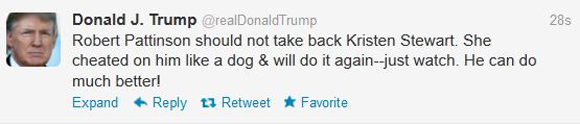 O μεγιστάνας Donald Trump πλήττει. Δεν εξηγείται αλλιώς η ξαφνική ενασχόλησή του, μέσω αναρτήσεων στο Twitter, με τα πάντα. Ακόμα και τη σχέση του Robert Pattinson με την Kristen Stewart σχολίασε…