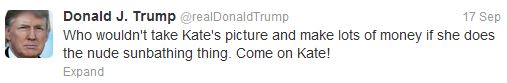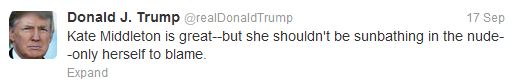 Αν η Kate Middleton αναζητούσε συμμάχους στην περιπέτειά της με τις ημίγυμνες φωτογραφίες, δεν θα έπρεπε να ψάξει προς την πλευρά του πάμπλουτου Donald Trump.Εκείνος ως επιχειρηματίας, πίσω από εκείνες τις topless φωτογραφίες είδε το χρήμα να κυλάει και γι΄αυτό θεωρεί υπεύθυνη μόνο τη Δούκισσα.Έγραψε στο twitter του: