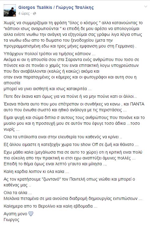 Ένας από αυτούς ήταν και ο Γιώργος Τσαλίκης, ο οποίος διευκρίνησε μέσω facebook ότι έλειπε για επαγγελματικούς λόγους στην Γερμανία και ήταν ένα ταξίδι προγραμματισμένο εδώ και πολύ καιρό.