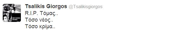 “R.I.P Τόμας”, έγραψε στο twitter ο Γιώργος Τσαλίκης, μόλις έμαθε τα δυσάρεστα νέα για την απώλεια του ηθοποιού.