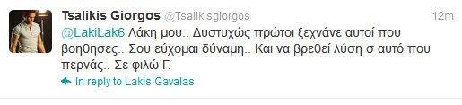 Ο Γιώργος Τσαλίκης μέσω twitter ρίχνει τα “καρφιά” του και εύχεται καλή δύναμη στο Λάκη Γαβαλά…