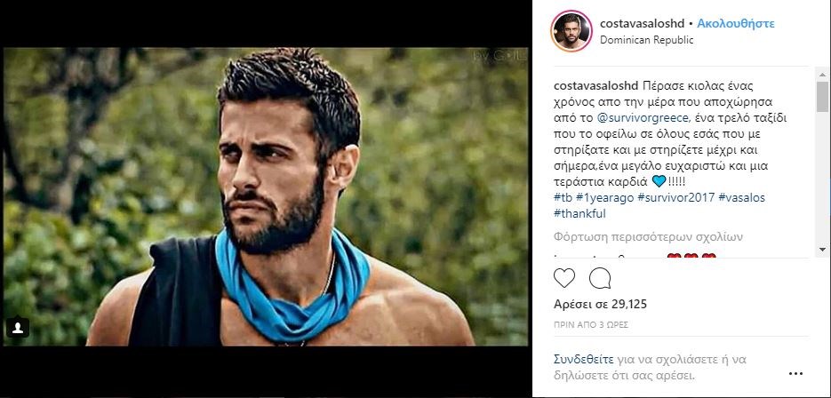 “Πέρασε κιόλας ένας χρόνος από την μέρα που αποχώρησα από το @survivorgreece, ένα τρελό ταξίδι που το οφείλω σε όλους εσάς που με στηρίξατε και με στηρίζετε μέχρι και σήμερα,ένα μεγάλο ευχαριστώ και μια τεράστια καρδιά!!!!! #tb #1yearago #survivor2017 #vasalos #thankful”