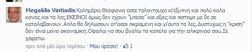 “Καλημέρα. Θεοφανία είσαι ταλαντούχα κι έξυπνη και πολύ καλά κάνεις και τα λες. Εκείνοι όμως δεν έχουν “μπέσα” και αξίες και πίστεψέ με δεν σε καταλαβαίνουν. Απλά θα δηλώσουν ότι είσαι πικραμένη και γι΄ αυτό τα λες. Δυστυχώς η “κρίση” δεν είναι μόνο οικονομική. Οφείλω να σου βγάλω το καπέλο για την ειλικρίνεια σου. Σε χαιρετω”.