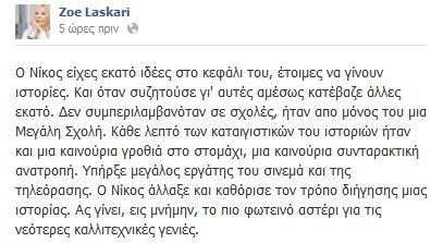 Με ένα συγκινητικό μήνυμα στην προσωπική της σελίδα στο Facebook αποχαιρέτησε η Ζωή Λάσκαρη τον Νίκο Φώσκολο.
