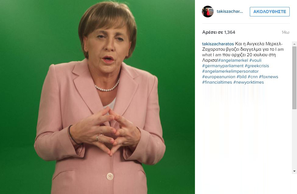 Μετά τον Γιάνη Βαρουφάκη, ο Τάκης Ζαχαράτος μεταμφιέστηκε σε Άνγκελα Μέρκελ και πόσταρε την παρακάτω φωτογραφία στο instagram.