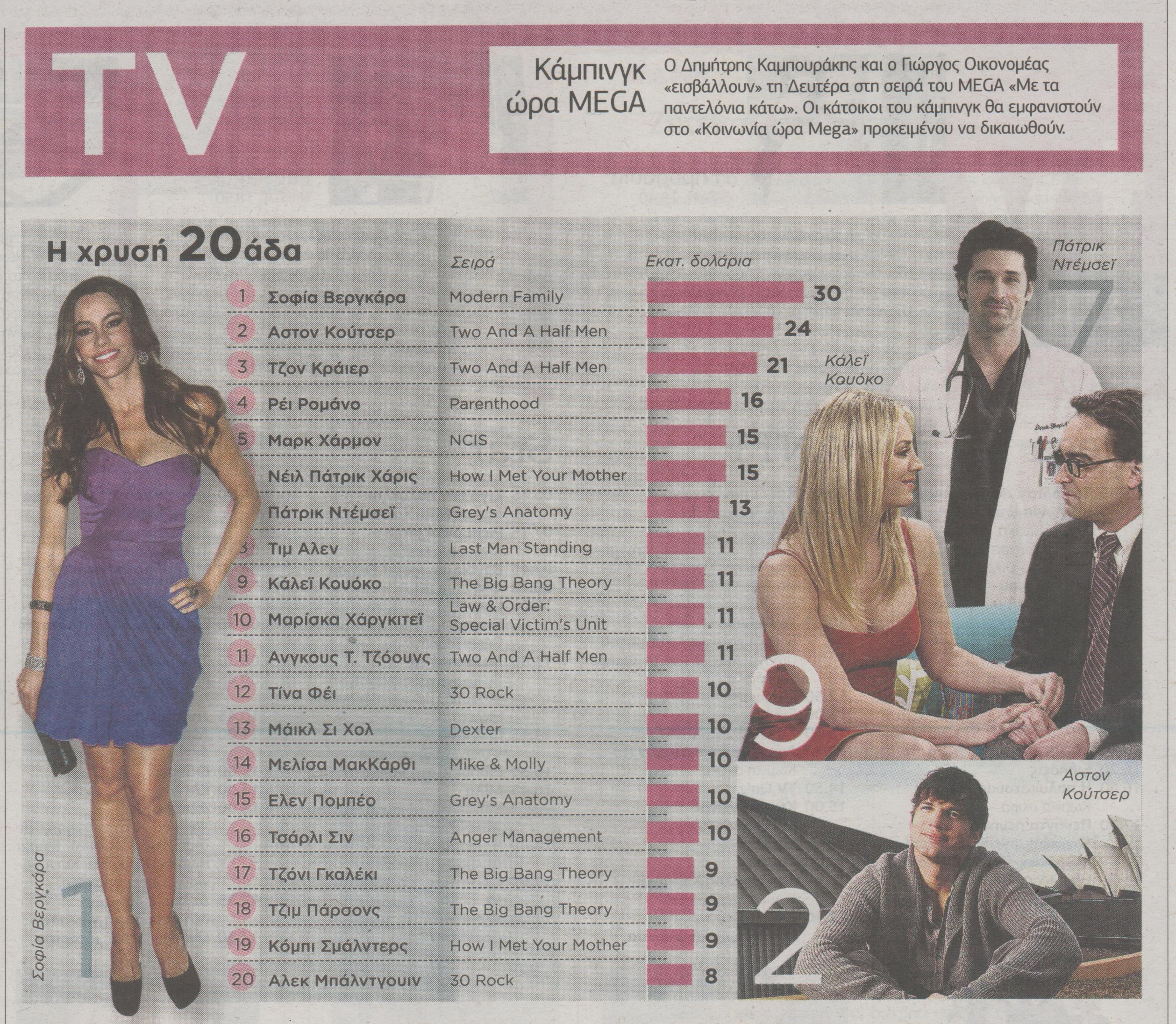 Ούτε ένας ούτε δύο αλλά… είκοσι είναι οι πιο ακριβοπληρωμένοι τηλεοπτικοί ηθοποιοί της αμερικανικής τηλεόρασης σύμφωνα με το περιοδικό «Forbes».