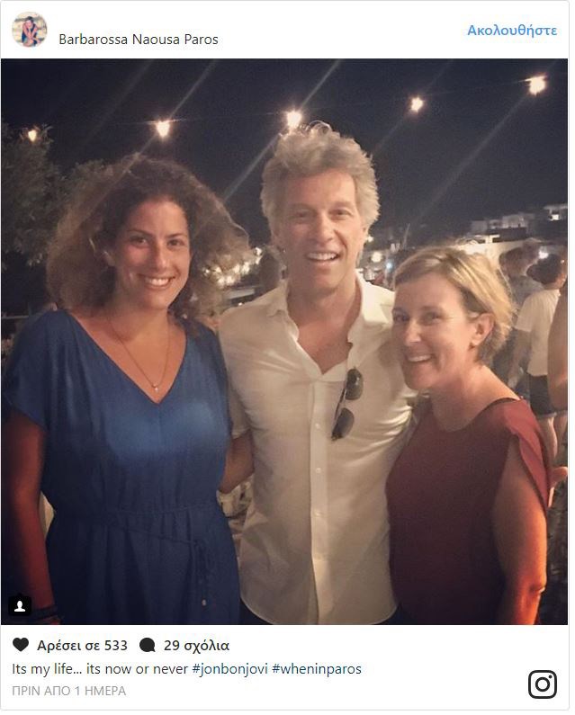 Ο Τζον Μπον Τζόβι «ψήφισε» Ελλάδα για τις καλοκαιρινές του διακοπές. Ο διάσημος ροκ σταρ, μετά τη Μύκονο επισκέφθηκε την Πάρο.