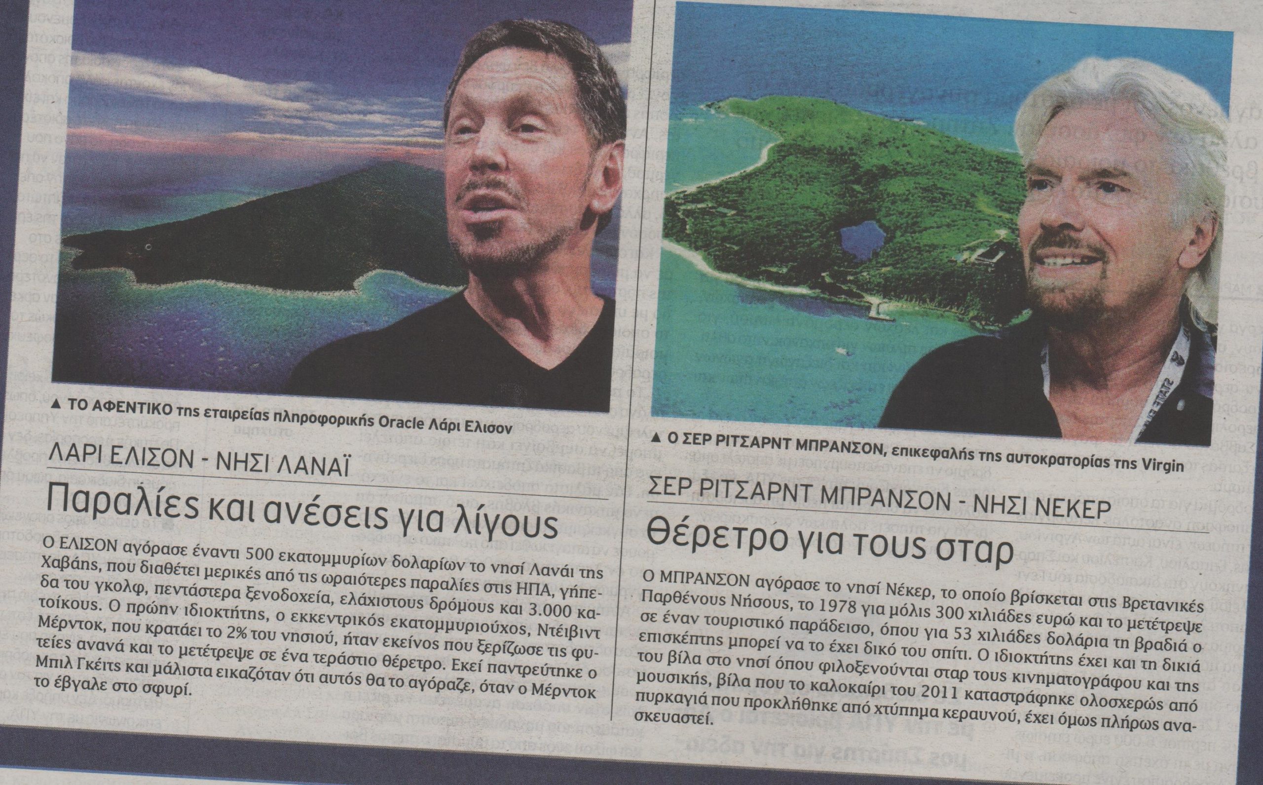 Πάντως, η λίστα των εκατομμυριούχων που αγοράζει ένα νησί όλο και μεγαλώνει, εξάλλου κυκλοφορεί και ως ανέκδοτο μεταξύ των κοσμικών κύκλων ότι δηλαδή δεν είσαι πραγματικά πλούσιος, αν δεν έχεις στην ιδιοκτησία σου ένα νησί.
