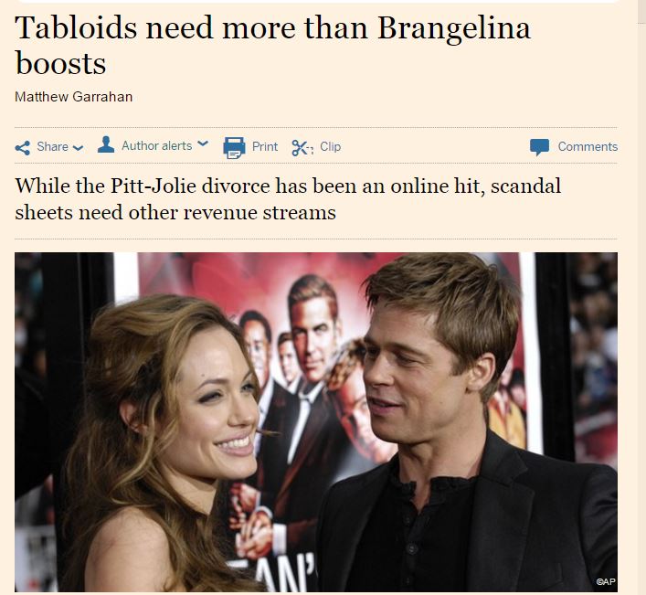 Ο διεθνής Τύπος έχει ασχοληθεί με το διαζύγιο του ζεύγους Τζολί-Πιτ που έσκασε σαν βόμβα στον καλλιτεχνικό χώρο, η οικονομική εφημερίδα Financial Times δεν αποτέλεσε εξαίρεση.