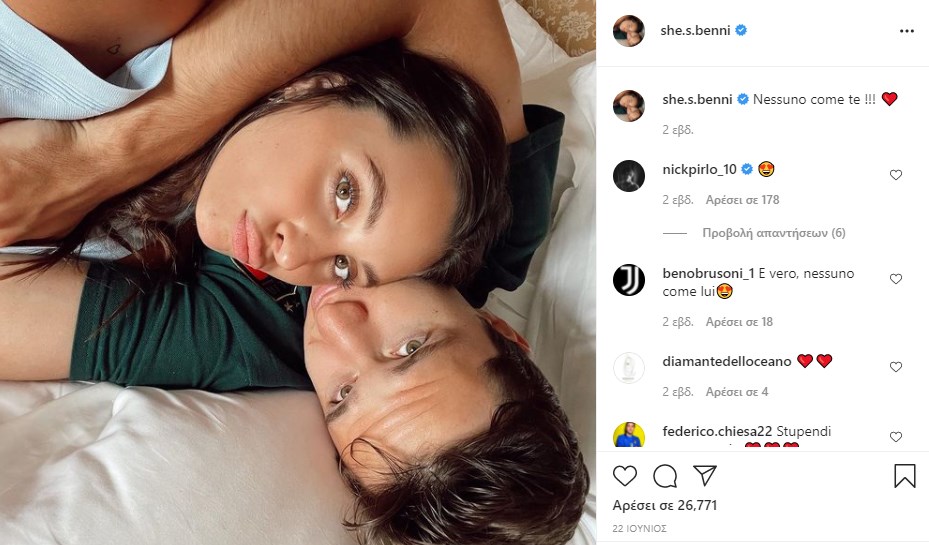 Ο μέσος Federico Chiesa, περιγράφεται ως ο νέος σταρ μετά τις τελευταίες του εμφανίσεις στα παιχνίδια του Euro. Ο 23χρονος, ο οποίος παίζει ως δανεικός στην Γιουβέντους από την Φιορεντίνα, έχει γίνει ένας από τους πιο σημαντικούς παίκτες της ομάδας όταν ο Κριστιάνο Ρονάλντο δεν αποδίδει. Αυτή την περίοδο έχει σχέση με το μοντέλο Benedetta Quagli, η οποία δημοσίευσε μια φωτογραφία στην οποία ο ποδοσφαιριστής πανηγυρίζει μετά το πρώτο γκολ στο ματς με την Ισπανία. Το ζευγάρι είναι μαζί περίπου δύο χρόνια, και συχνά δημοσιεύουν ρομαντικές φωτογραφίες από τα εξωτικά τους ταξίδια.