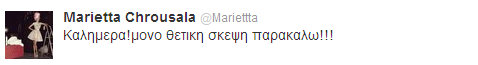 Μπορεί ο Ευάγγελος Βενιζέλος να πανηγυρίζει για την επίτευξη της συμφωνίας και του PSI αλλά οι Έλληνες δεν φαίνεται να το αντιμετωπίζουν και πολύ καλά.Η ψυχολογία των Ελλήνων έχει πέσει… στα τάρταρα!Έτσι, λοιπόν, η Μαριέττα Χρουσαλά και η Τάμτα, πριν από λίγο έγραψαν στο twitter τους: