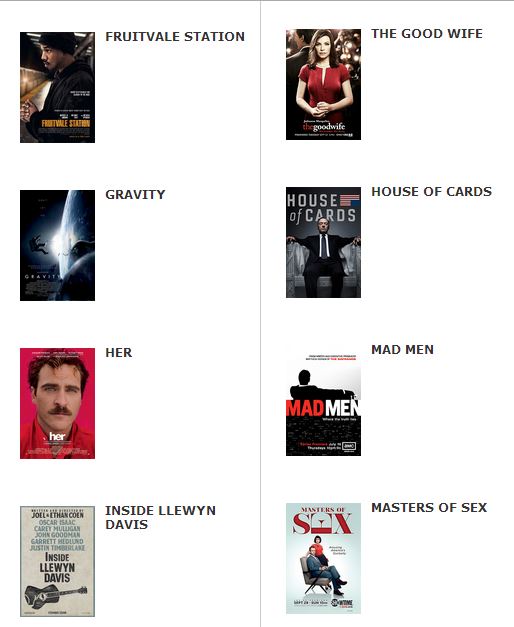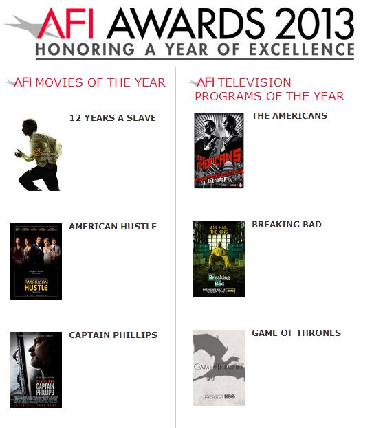 Το Ινστιτούτο Κινηματογράφου των ΗΠΑ (AFI) επέλεξε ως κορυφαίες για τη χρονιά τις ταινίες: «12 Years a Slave», «American Hustle»,«Captain Phillips», «Fruitvale Station», «Gravity», «Her», «Inside Llewyn Davis», «Nebraska», «Saving Mr. Banks» και «The Wolf of Wall Street».