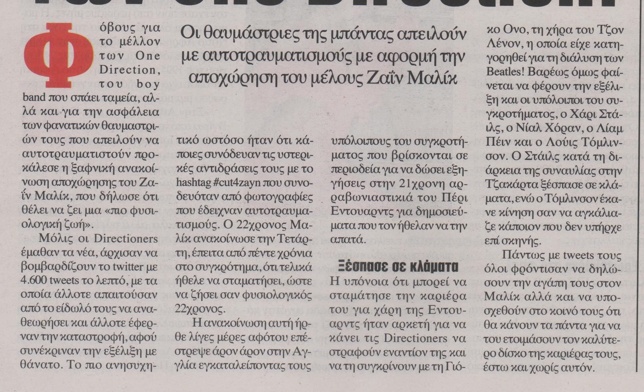 Οι θαυμάστριες του συγκροτήματος “One Direction” απειλούν με αυτοτραυματισμούς με αφορμή την αποχώρηση του μέλους Ζαϊαν Μαλίκ.