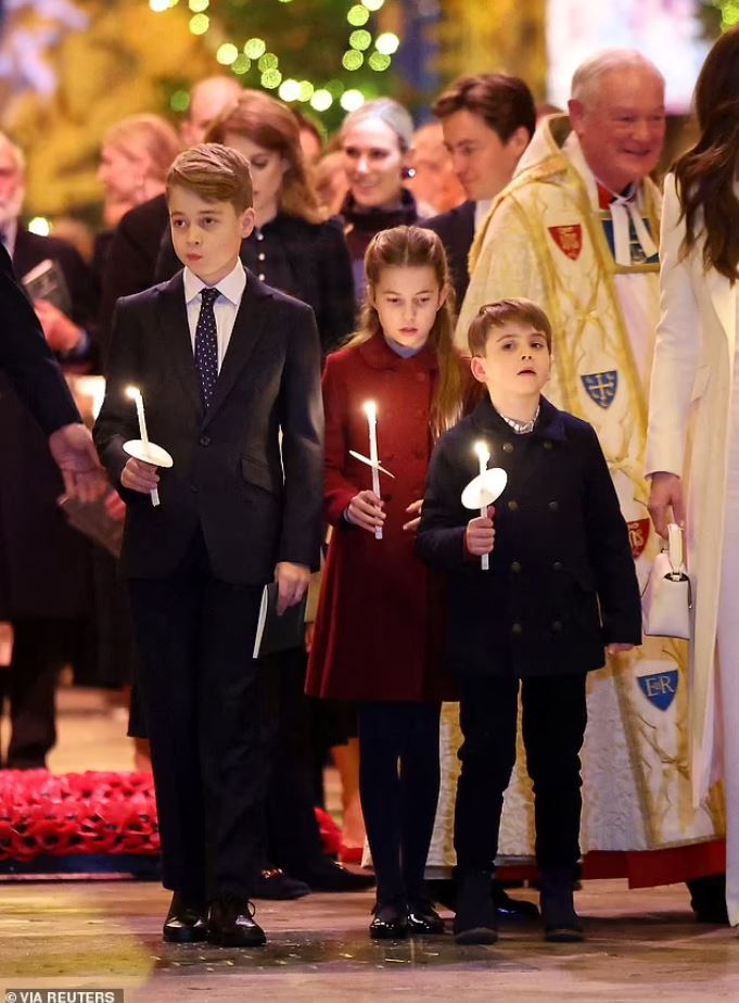 Ο 10χρονος Τζορτζ ήταν φτυστός ο πατέρας του με το κομψό του κοστούμι, ενώ ο Λούις, πέντε ετών, φορούσε ένα ναυτικό σακάκι με κουμπιά, παντελόνι και μπλε σουέτ μπότες Chelsea. Η πριγκίπισσα Σάρλοτ, 8 ετών, ήταν εξίσου κομψή με ένα μάλλινο παλτό σε μπορντό απόχρωση που κοστίζει 180 λίρες από την Trotters.