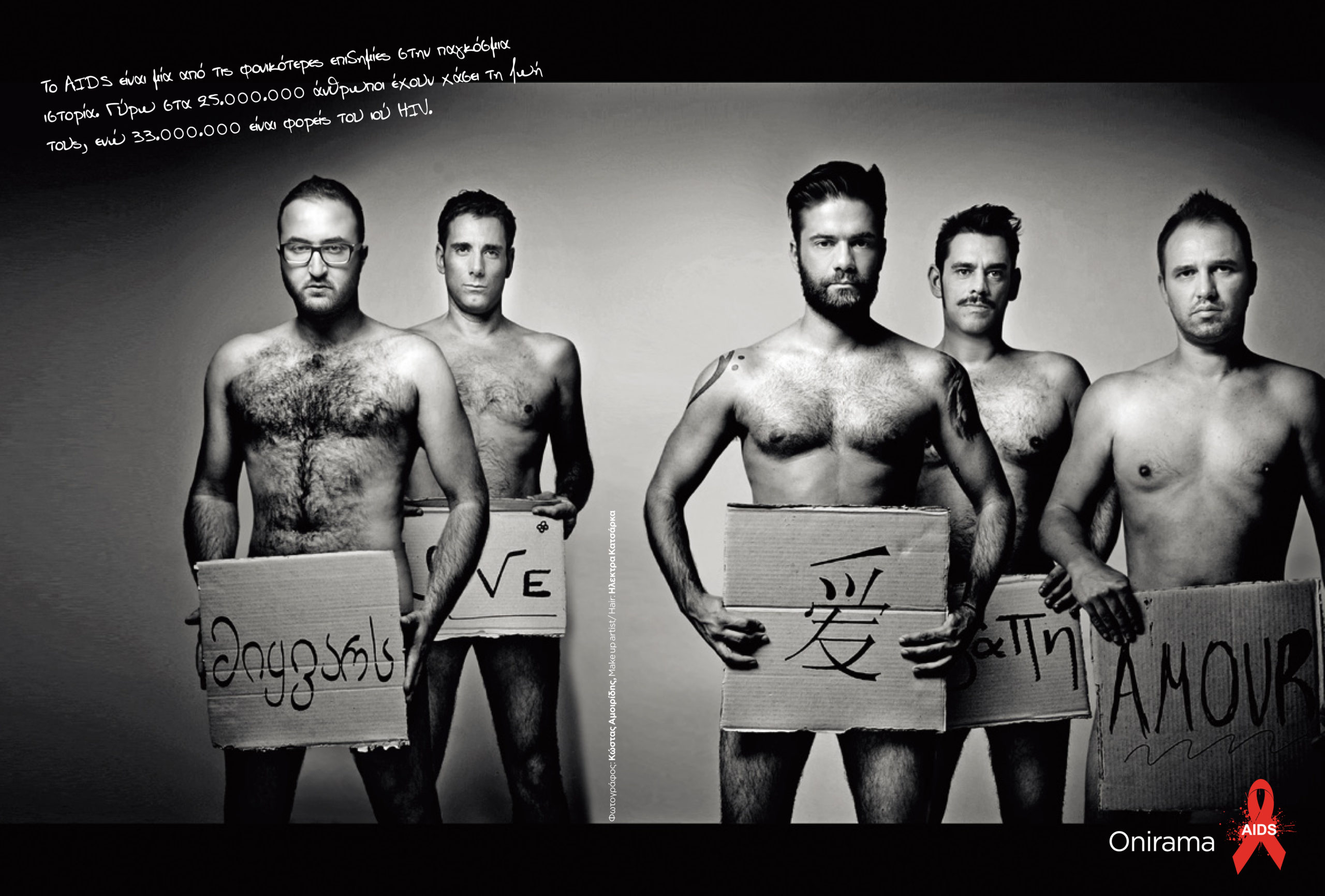 Φωτογραφίζονται γυμνοί για το περιοδικό “Adore”, στο πλαίσιο της εκστρατείας κατά του AIDS, μαζί με άλλους 39 Θεσσαλονικείς καλλιτέχνες. Στα χέρια τους κρατούν χαρτόνια, με τη λέξη αγάπη σε πέντε διαφορετικές γλώσσες.