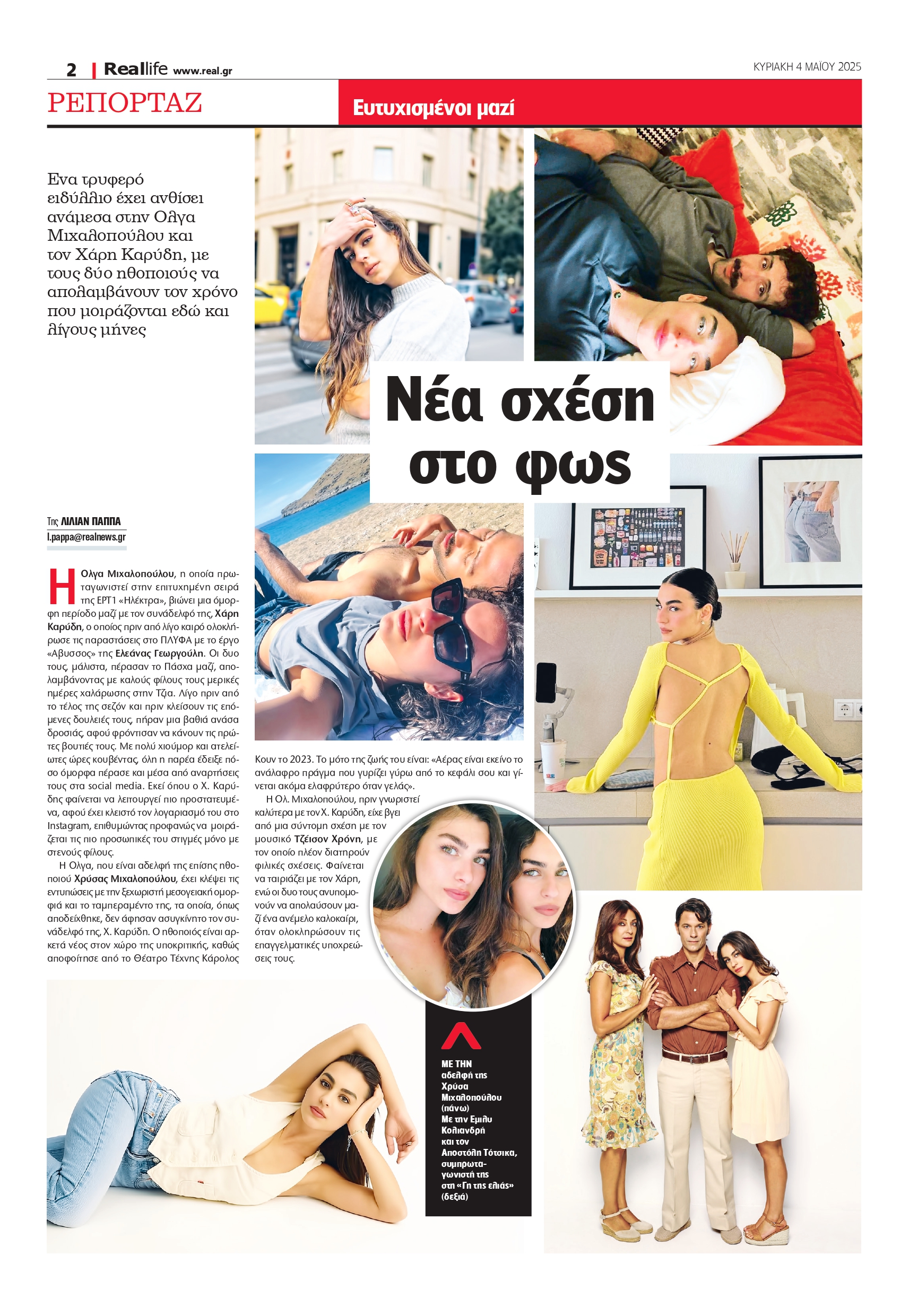 Η Ολ. Μιχαλοπούλου, πριν γνωριστεί καλύτερα με τον Χ. Καρύδη, είχε βγει από μια σύντομη σχέση με τον μουσικό Τζέισον Χρόνη, με τον οποίο πλέον διατηρούν φιλικές σχέσεις. Φαίνεται να ταιριάζει με τον Χάρη, ενώ οι δυο τους ανυπομονούν να απολαύσουν μαζί ένα ανέμελο καλοκαίρι, όταν ολοκληρώσουν τις επαγγελματικές υποχρεώσεις τους.