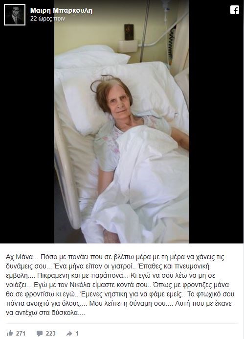 “Αχ Μάνα… Πόσο με πονάει που σε βλέπω μέρα με τη μέρα να χάνεις τις δυνάμεις σου… Ένα μήνα είπαν οι γιατροί.. Έπαθες και πνευμονική εμβολή…. Πικραμένη και με παράπονα… Κι εγώ να σου λέω να μη σε νοιάζει… Εγώ με τον Νικόλα είμαστε κοντά σου.. Όπως με φρόντιζες μάνα θα σε φροντίσω κι εγώ.. Έμενες νηστική για να φάμε εμείς.. Το φτωχικό σου πάντα ανοιχτό για όλους…. Μου λείπει η δύναμη σου… Αυτή που με έκανε να αντέχω στα δύσκολα”, έγραψε στην ανάρτηση της.