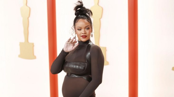 Η εγκυμονούσα Ριάνα εντυπωσίασε με την εμφάνισή της στο «σαμπανιζέ» χαλί των βραβείων Oscars 2023.