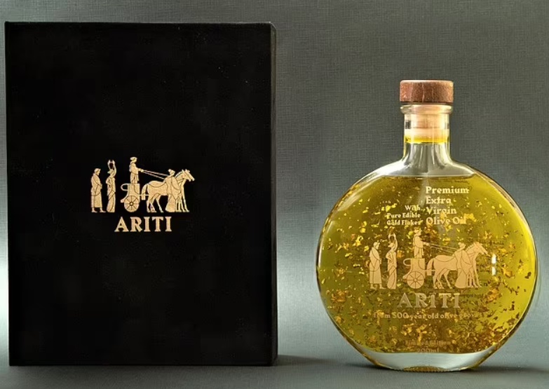 Ανάμεσα στα δώρα υπάρχει και ένα που έχει χρώμα και… γεύση ελληνική. Δεν είναι άλλο από ένα μπουκάλι από το έξτρα παρθένο ελαιόλαδο Ariti, το οποίο θυμίζει μπουκάλι αρώματος.