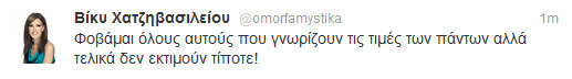 Κάτι η μέρα, το κρύο, κάτι ο μουντός καιρός, φαίνεται πως η Βίκυ Χατηζβασιλείου είχε διάθεση να φιλοσοφήσει.Τι έγραψε σήμερα στο twitter της;